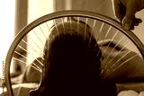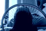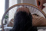 Close-up of a woman receiving a head massage during a Japanese head spa treatment with water flowing from a special hair washing tool, focusing on the scalp relaxation and beauty therapy