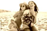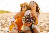 Young female friends having fun together on sandy beach with a bouquet of wild flowers. Two happy women relaxing and enjoying sunset outdoors. Vacation, weekend and friendship concept.
