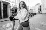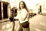 A beautiful tourist on an electric scooter rides along sunny streets. Young woman enjoys traveling, weekends and walking outdoors. Lifestyle.