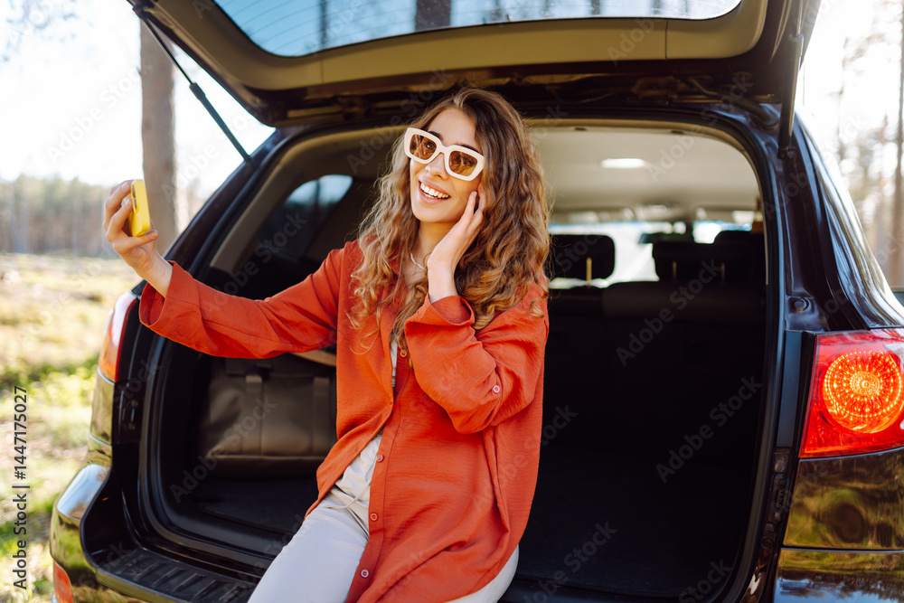 Stylish woman in sunglasses taking a selfie on her phone while sitting in the trunk of a car. Young female traveler enjoying the sunset in the forest near her car with her phone. Car travel concept.
