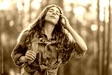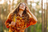 Portrait of young woman with yellow backpack feeling freedom and enjoying sunny weather on hike. Travel, leisure, freedom concept. Active lifestyle.