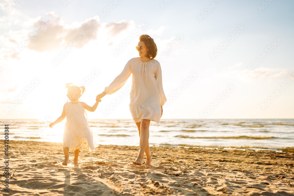 A beautiful woman and her child walk on a sunset beach. A young mother and her daughter enjoy the sunset at sea, spend time together. Weekend, vacation concept.