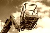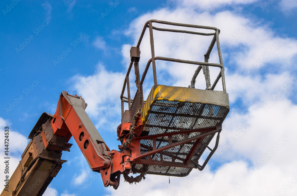 Worker lift basket on arm.