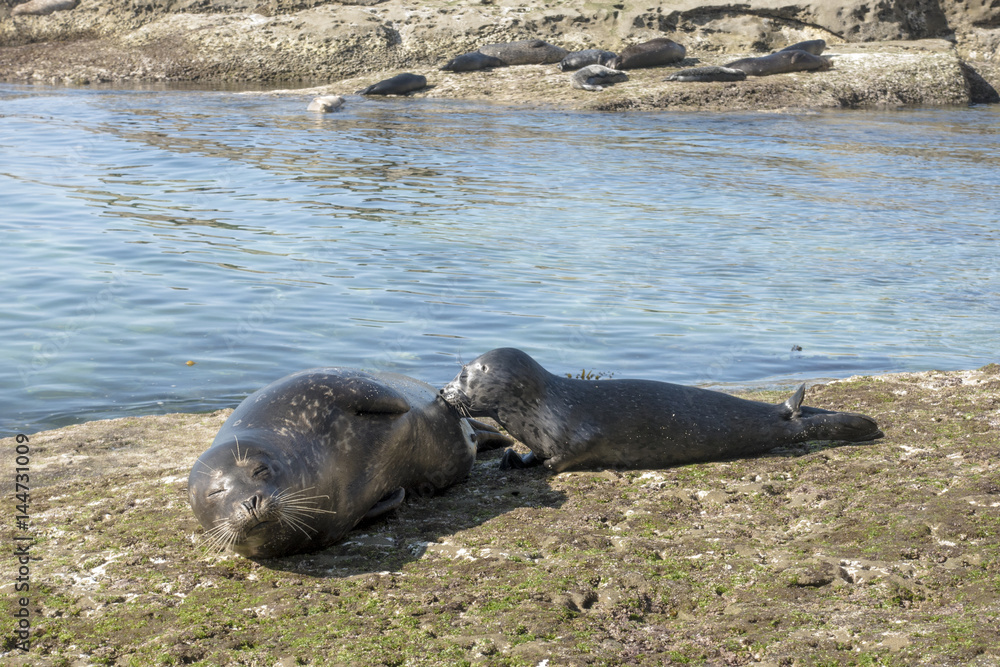 Sea Lion milking baby seal on the beach, La Jolla, California.