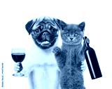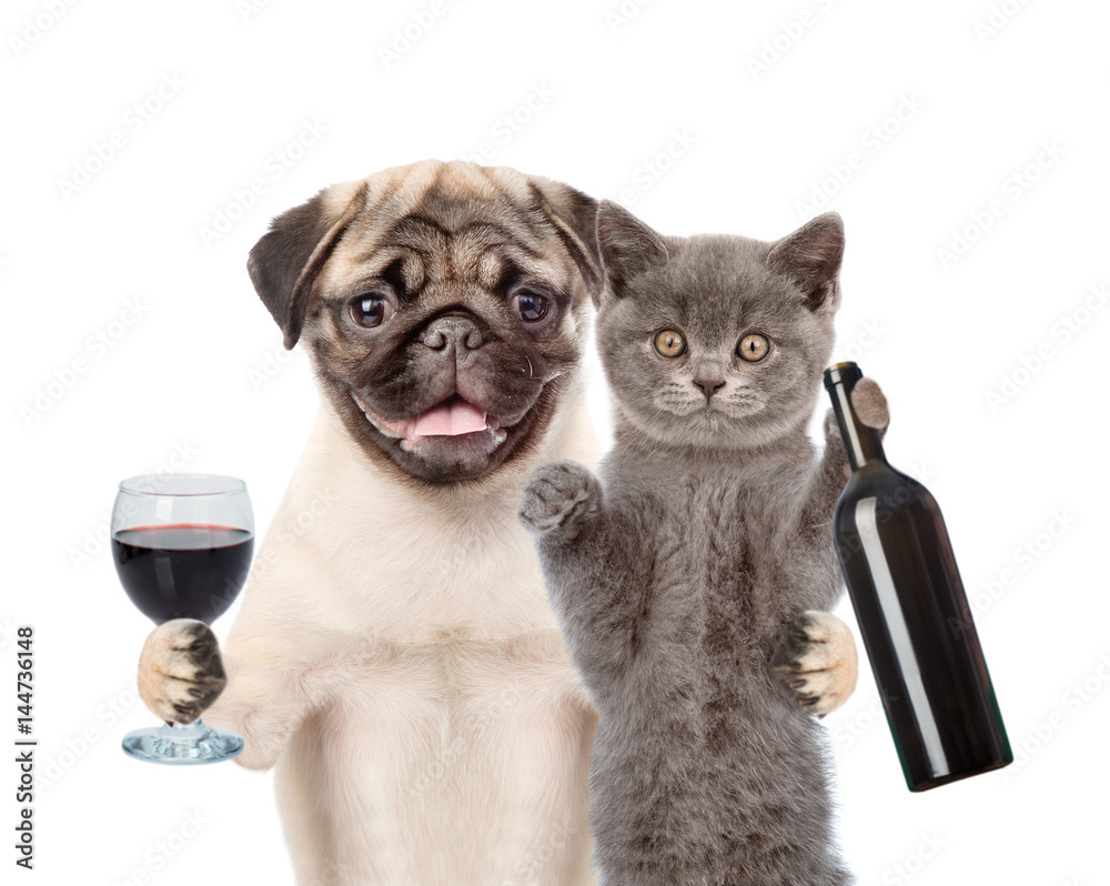 Puppy and kitten holding a bottle of red wine and wineglass. isolated on white background