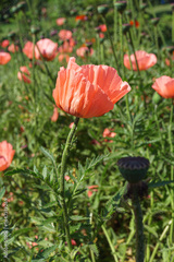 Decorative red poppies, papaver oriental flowers blossom on wild field or meadow in green grass in sunny summer day. Nature, floral background, backdrop, wallpaper