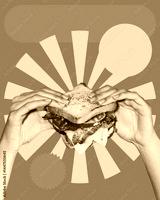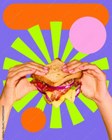 Two hands holding layered sandwich with bacon, cheese, tomato over colorful pop art background in purple orange and green. Concept of food, pop art, poster, ads. Contemporary art collage.