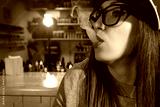 Young pretty woman in red cap smoke an electronic cigarette at the vape shop. Closeup.