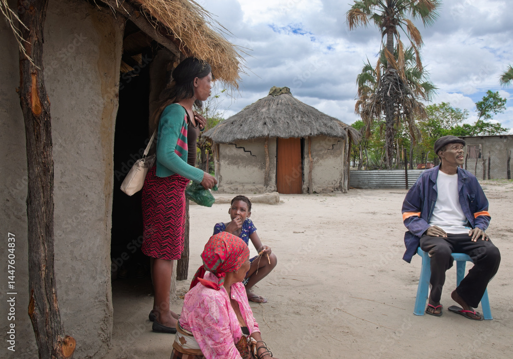 village african family mother child and grandparents siting waiting in the yard, serious facial expression poverty