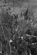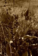 Red tulips among the degraded old plants