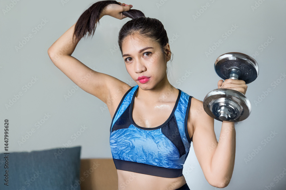 Asian woman exercising with dumbbells at home. Fitness, health, and active lifestyle concept