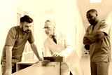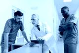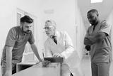 Intelligent aged practitioner helping young colleagues in the clinic