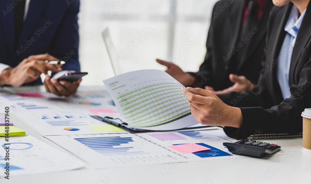 Auditor team working in office. Businessman meeting with financial advisors discussing budget planning and analyzing company financial reports.