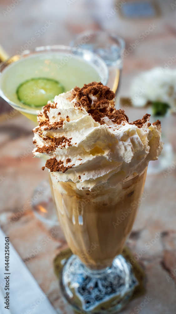 Chilled coffee and ice cream topped with whipped cream or Schlag. A delightful fusion drink for those with a sweet tooth. It's sweet and brimming with rich coffee aroma. A fine dine in experience