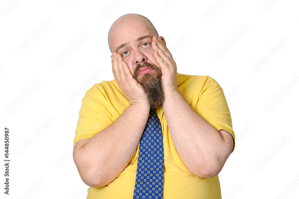 Funny sad middle-aged man on a pure white background..