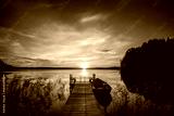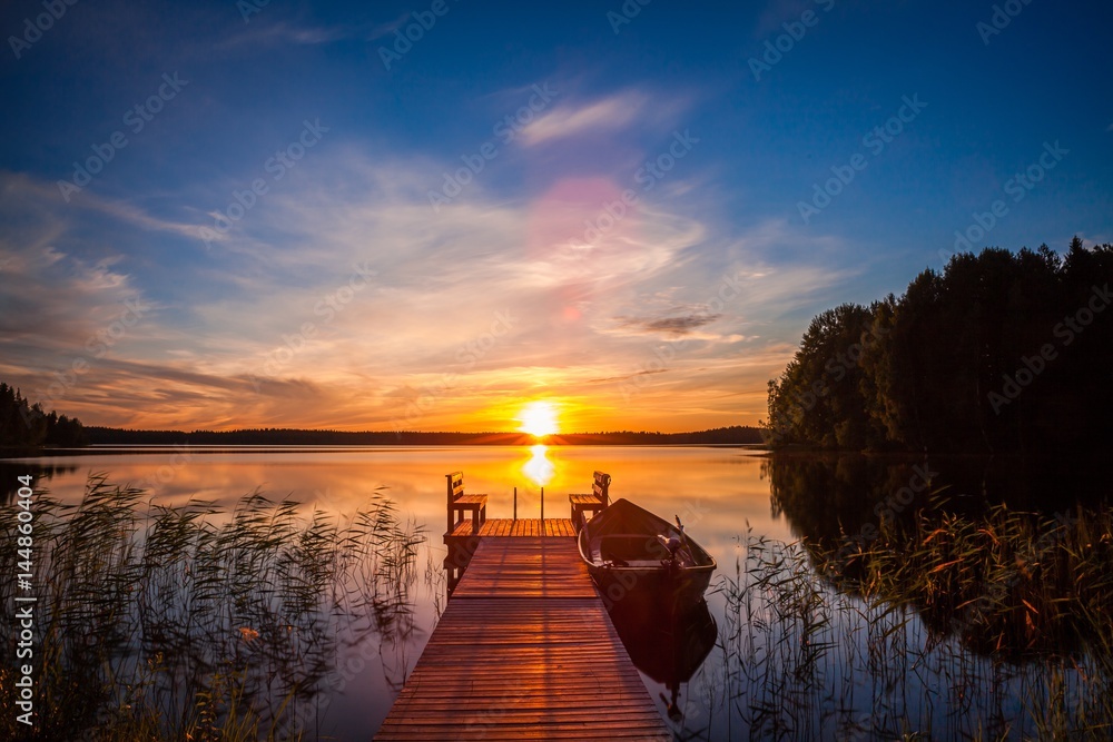 Sunset over the fishing pier at the lake in Finland