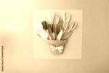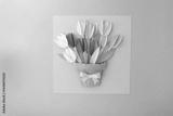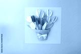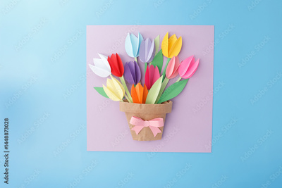 Colorful paper bouquet in brown pot with pink bow on pastel background, ideal for paper product packaging, craft supply advertising, or creative branding visuals
