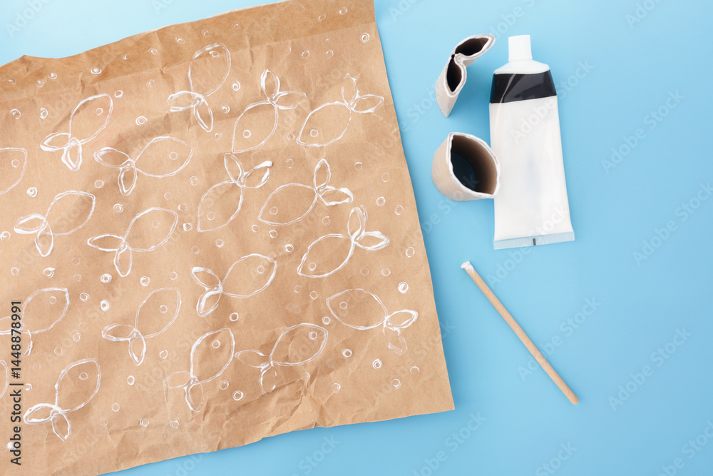 Stamped fish pattern made with toilet paper rolls and white paint on brown kraft paper. Paint tube and tool placed beside the artwork. Flat lay composition. DIY kids craft and recycling education