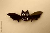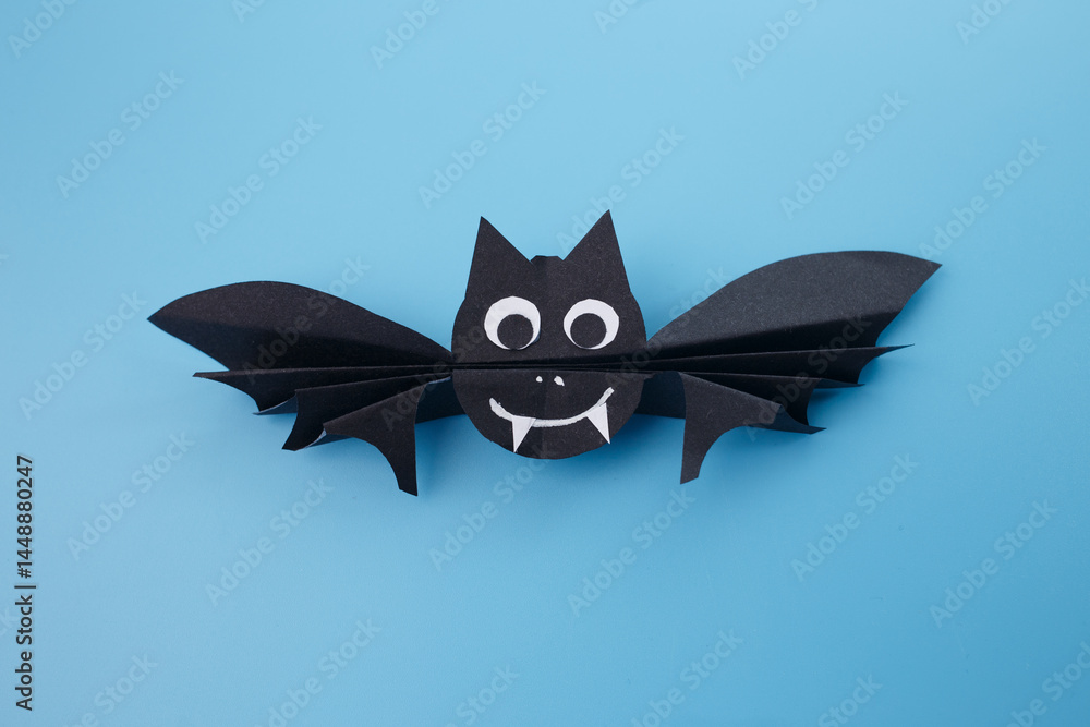 Black paper bat with white eyes and fangs on light blue background, ideal for Halloween decorations, kids crafts, DIY guides, creative content, and educational material design