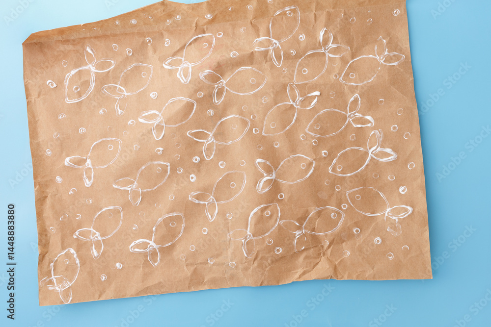 Creative eco craft with white paint and cardboard tubes forming fish pattern on kraft paper, ideal for DIY tutorials, kids workshops, educational brands, sustainable packaging design