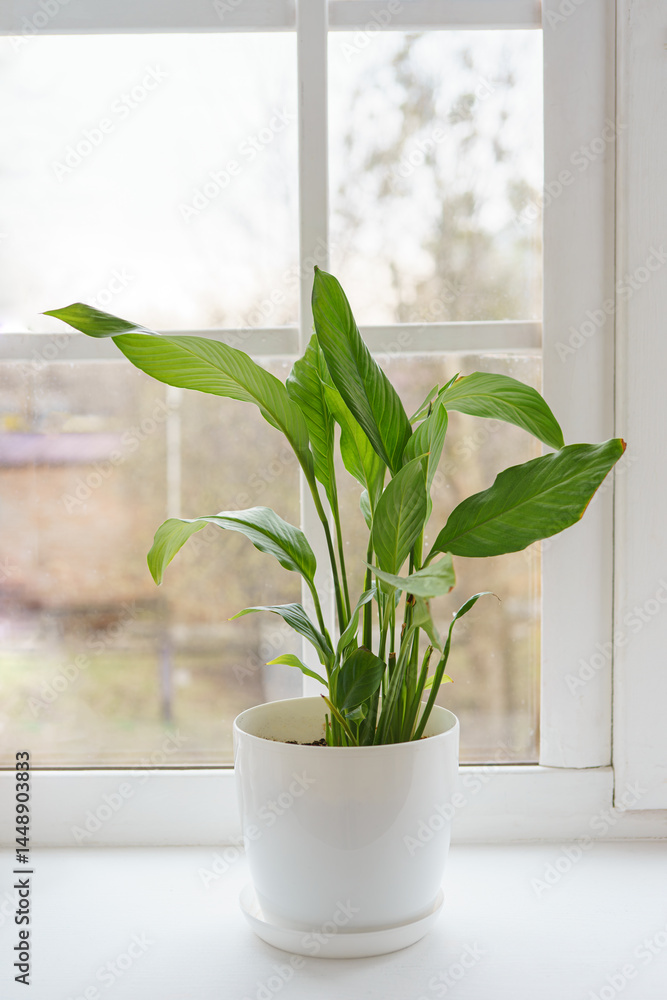 Fresh green decorative houseplant Spathiphyllum in white pot on a windowsill. Ornamental plant, flower breeding, decor fo home interior.