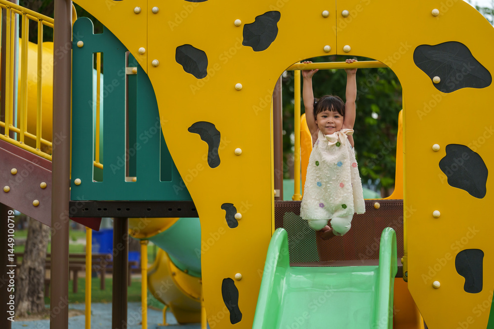 happy toddler girl hanging the yellow bar by her hand at outdoor playground in park