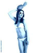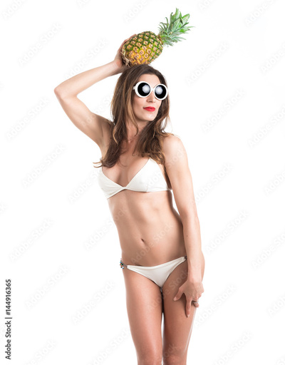 Portrait of young healthy beautiful woman in white bikini and white sunglasses with fresh pineapple in a hand. Funny Fruit Concept. Isolated on white