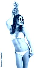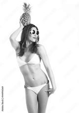 Portrait of young healthy beautiful woman in white bikini and white sunglasses with fresh pineapple in a hand. Funny Fruit Concept. Isolated on white