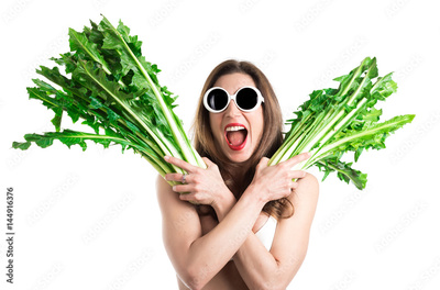 Portrait of young healthy woman in white bikini and white sunglasses with fresh chicory in a hand. Funny Vegetables Concept. Isolated on white