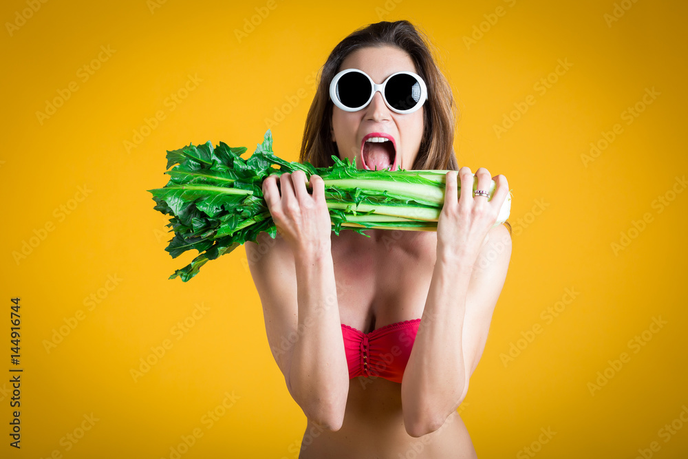 Portrait of young healthy woman in white bikini and white sunglasses play funny with fresh chicory in hand. Funny Vegetables Concept. Isolated on yellow.