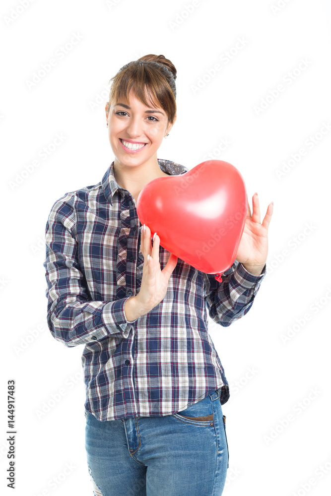 Beautiful young brunette woman playing with red heart shape balloon isolated on white background