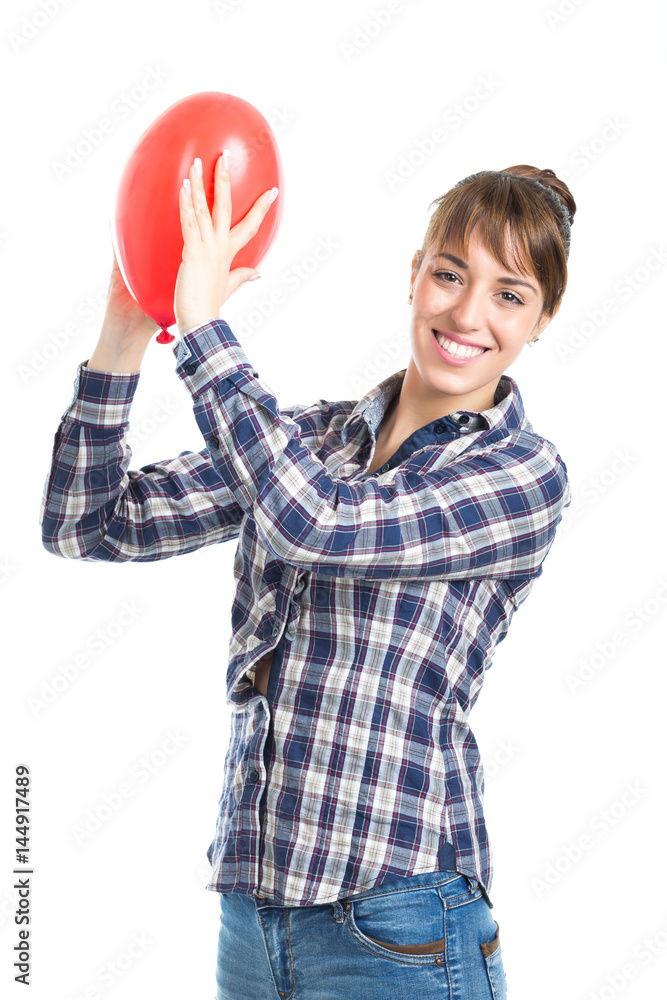 Beautiful young brunette woman playing with red heart shape balloon isolated on white background