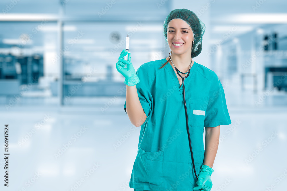 Young nurse with stethoscope standing and looking syringe in hand. Concept medical and Healty.