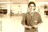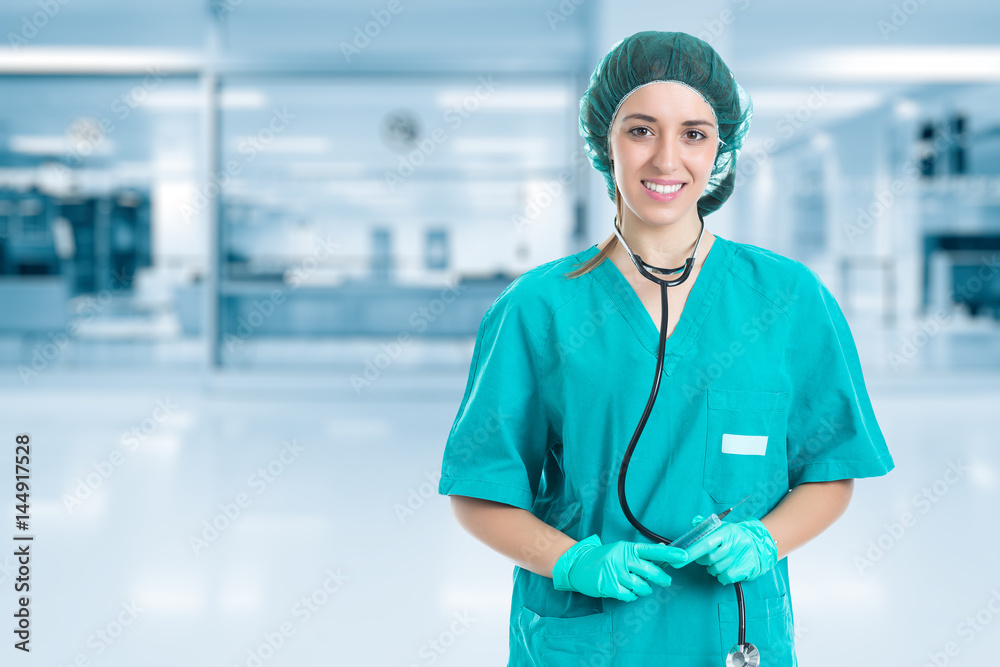 Young nurse with stethoscope standing and looking syringe in hand. Concept medical and Healty.
