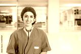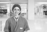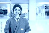 Young nurse with stethoscope standing and looking syringe in hand. Concept medical and Healty.