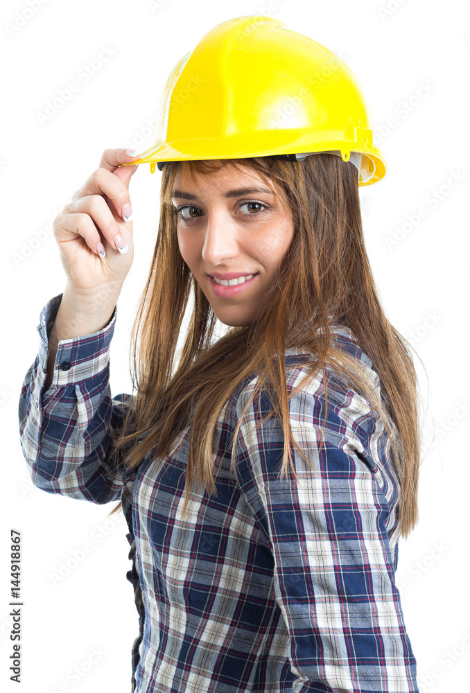 Attractive young woman builder with helmet and work glove. Isolated on white background.