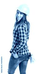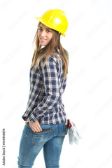 Attractive young woman builder with helmet and work glove. Isolated on white background.