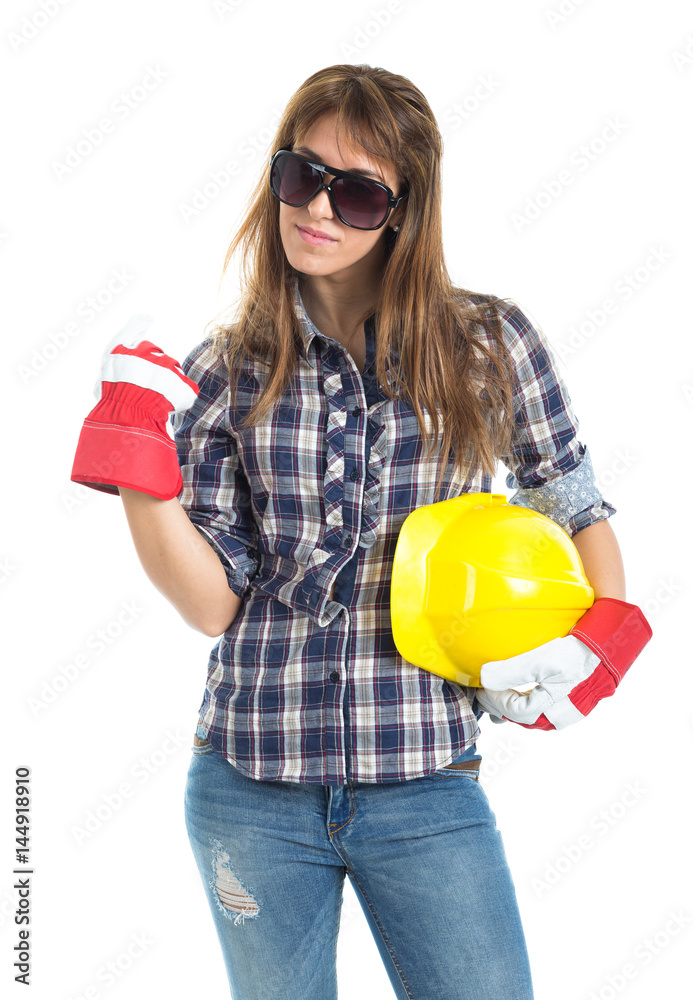 Attractive young woman builder with helmet and work glove. Isolated on white background.