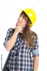 Young woman architect builder verify construction site work. Isolated on white background.