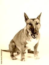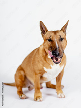 A licking red bull terrier on a white background.