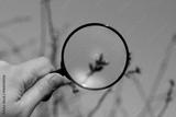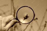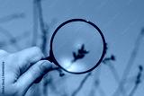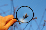 careful plant growth check/ Gardener inspects the buds of trees through magnifying glass in the spring