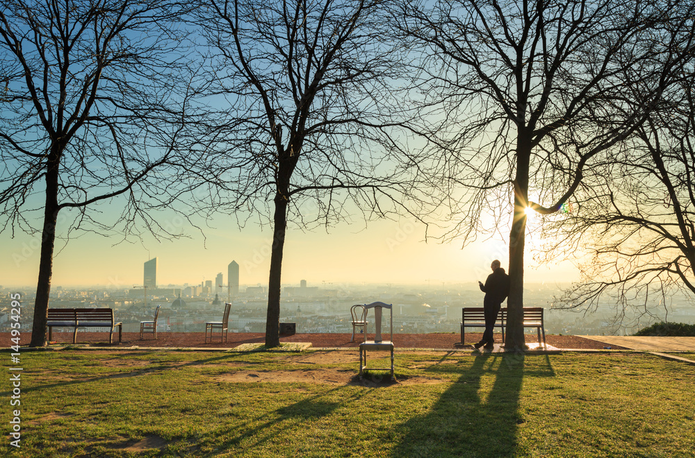 Man in a park in Lyon, enjoying the sunrise and checking his phone.