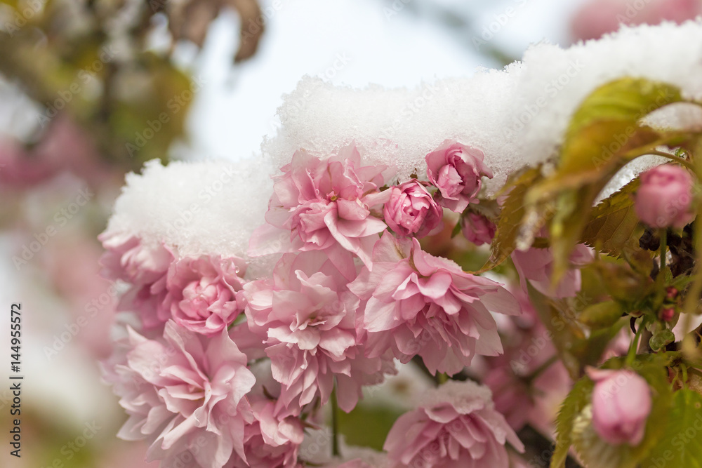 Closeup view of snowy sakura