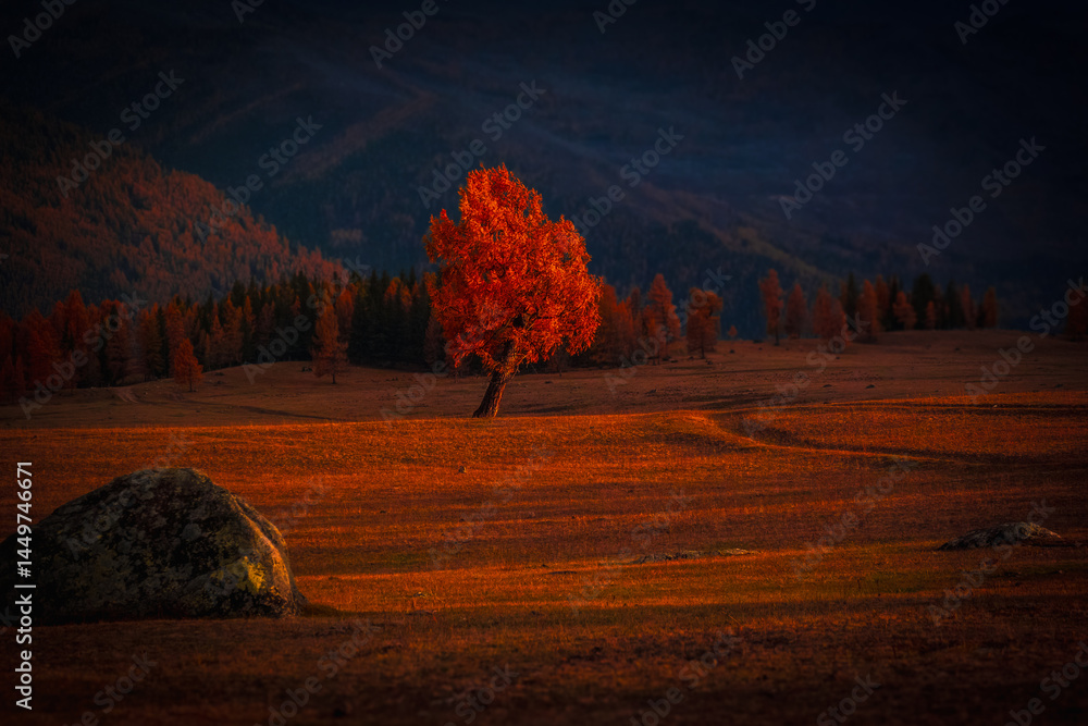 Solitary red tree amid vast fall landscape with warm hues and dramatic lighting
