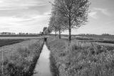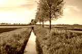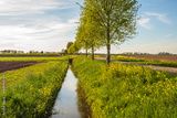 Dutch agricultural polder landscape with yellow blooming rapeseed along the ditch. The photo was taken on a slightly cloudy spring day.