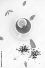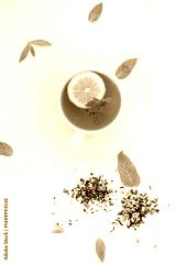 Fresh lemon slices on skewers and a cup of tea with mint and lemon, styled as a clean background image.