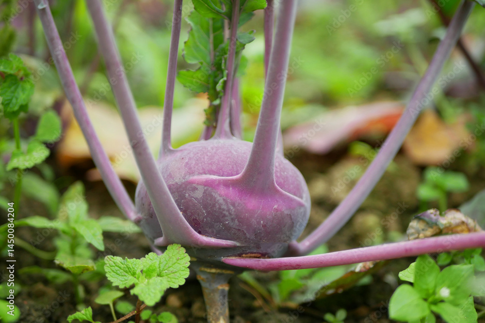 Kohlrabi bio red fresh harvest planting tuber detail weeds greenhouse foil field root crop turnip German white farm farming garden harvesting stem organic Brassica oleracea gongylodes Europe