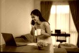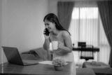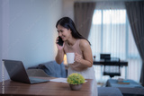 Smiling businesswoman standing at her desk, enjoying coffee while talking on the phone and working on her laptop in a cozy home office, balancing work and lifestyle effortlessly