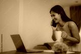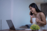 Happy freelancer working remotely from home, talking on mobile phone, drinking coffee and looking at laptop screen, enjoying relaxed work from home environment