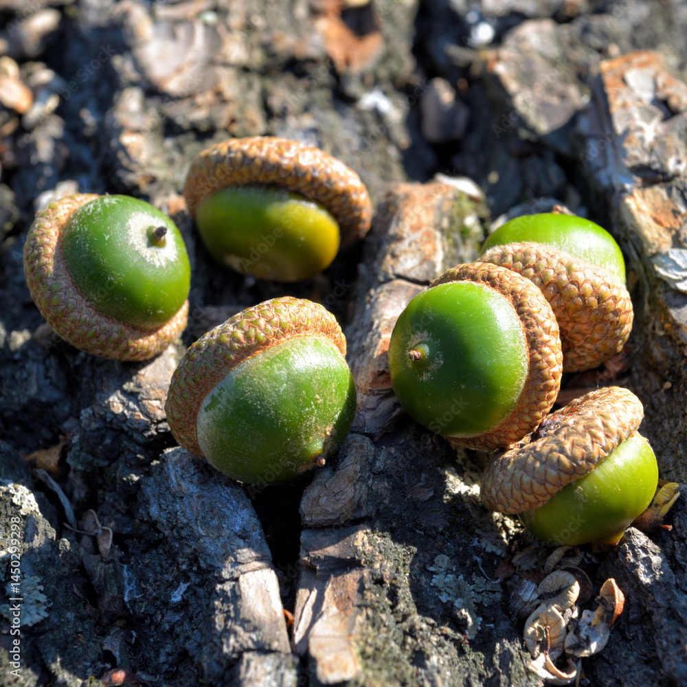 Young acorns on oak bark